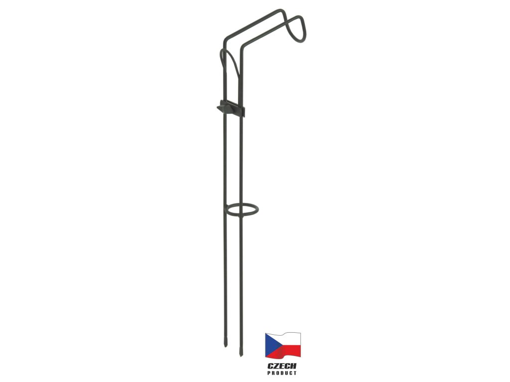 Kruhová nášlapná plocha a koncové hroty maximálně usnadňují zapichování držáku do terénu.